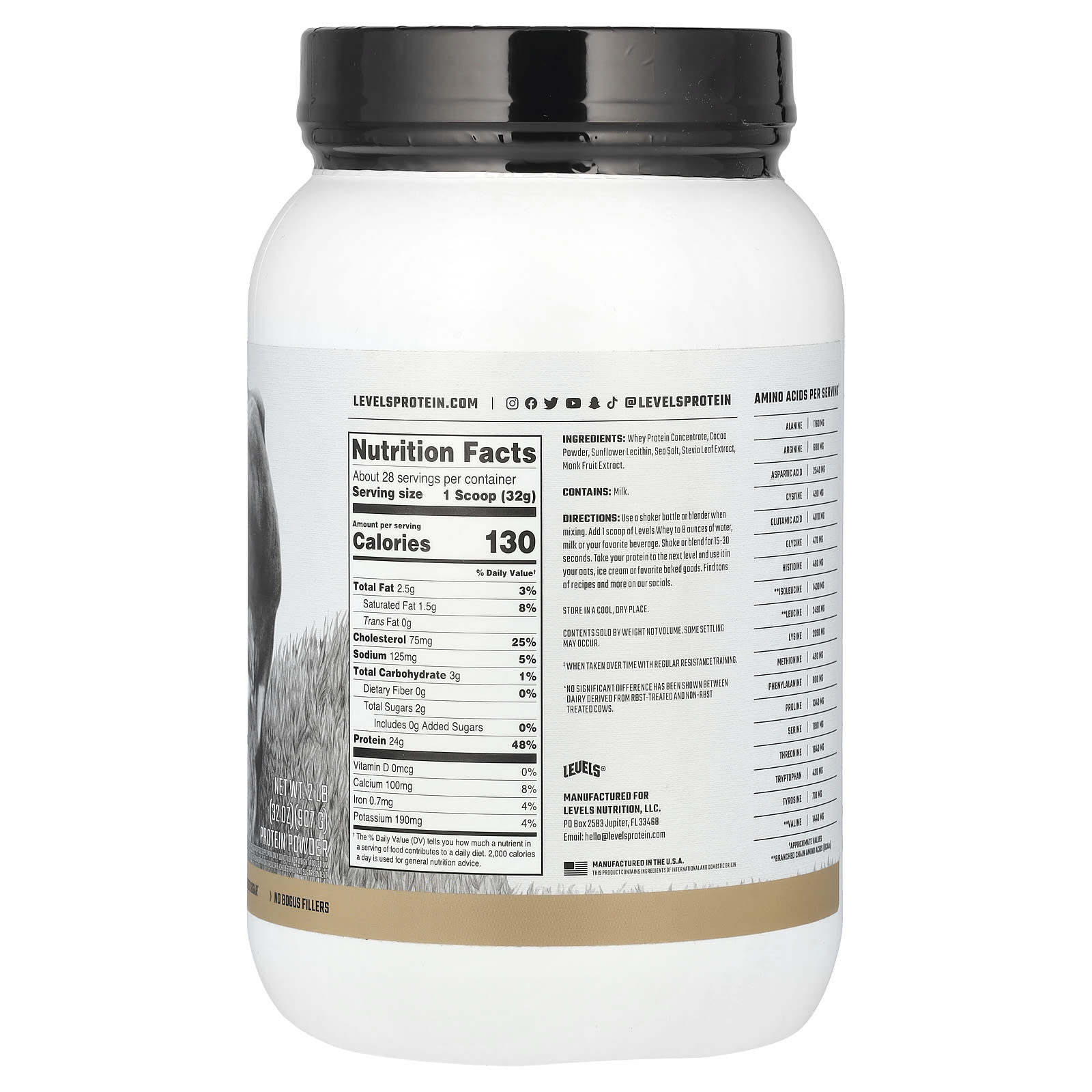 Levels Proteína Whey em Pó de Gado Criado no Pasto Chocolate Puro 907 g (2 lb) – Levels Nutrição Esportiva Proteína Proteína Whey.