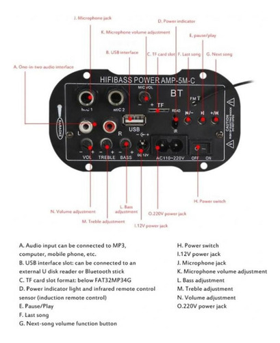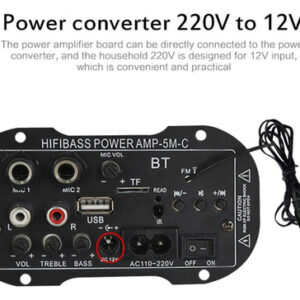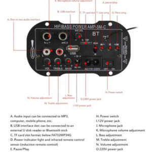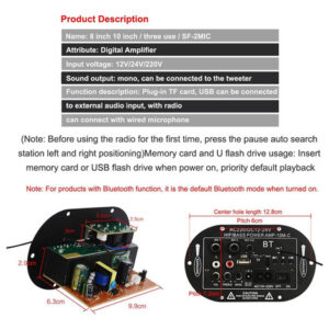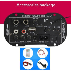 Equipado com Bluetooth sem fio, rádio, cartão de memória / unidade flash USB, modo de áudio. Adequado para instalação: subwoofer ou alto-falante de 5"! Alta e baixa qualidade de som fresca de áudio. Você pode ajustar a frequência alta e baixa, escolher uma experiência de som diferente e desfrutar de uma qualidade de som diferente. Compatível com 99% dos dispositivos Bluetooth do mercado. Suporta cartões, unidades flash USB, telefones celulares, computadores, MP3s e outros dispositivos. Interface de cartão USB/TF MP3 player embutido. Baixe sua música favorita em uma unidade flash USB ou cartão TF e desfrute de sua música favorita a qualquer momento. Depois que a corrente passa pelo amplificador de potência IC, 90% ~ 95% é convertido em um sinal sonoro e 5% ~ 10% é convertido em perda de calor, e o som é claro e confortável. Qualidade estável, economia de energia, baixo consumo de energia, baixa geração de calor e longa vida útil.
