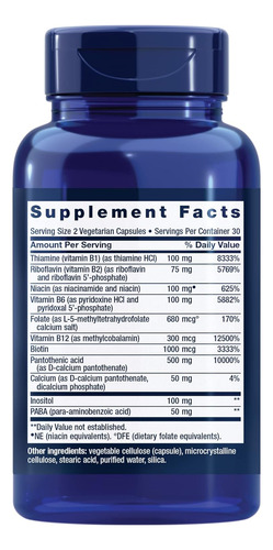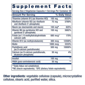 Perfil completo de vitaminas B: A fórmula inclui todas as oito vitaminas B essenciais: tiamina (B1), riboflavina (B2), niacina (B3), ácido pantotênico (B5), piridoxina (B6), biotina (B7), folato (B9) e cobalamina (B12).