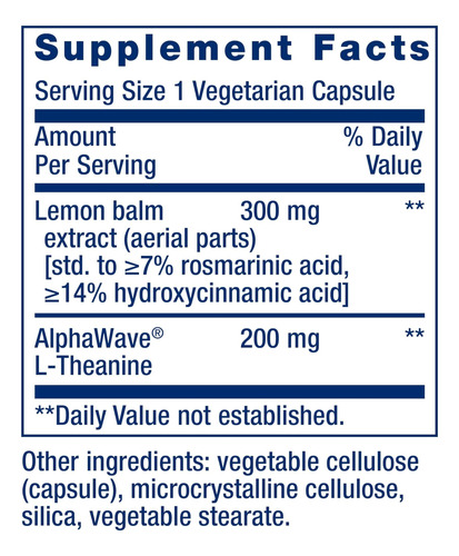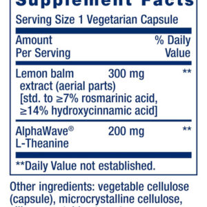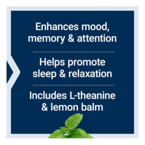 Esta fórmula inovadora combina dois ingredientes conhecidos por apoiar o relaxamento. A erva-cidreira (Melissa officinalis), uma erva perene da família das mentas, ajuda a promover o sono e o relaxamento. (Esse não é o único benefício: a erva-cidreira também ajuda a estimular a memória e a atenção!) A L-teanina, um aminoácido encontrado no chá verde, ajuda a inibir o estresse. A L-teanina produz efeitos calmantes no cérebro de uma forma que já foi comparada à meditação e à massagem. Estudos mostram que a L-teanina também melhora a capacidade do cérebro de se concentrar, aprender e lembrar.