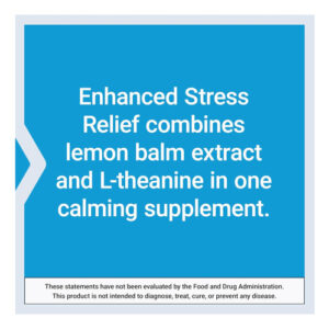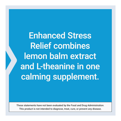 • Gerencie o estresse, não deixe que ele controle você ‘ Enhanced Stress Relief combina extrato de erva-cidreira e L-teanina, um aminoácido encontrado no chá verde, para criar um suplemento inovador de suporte ao estresse.