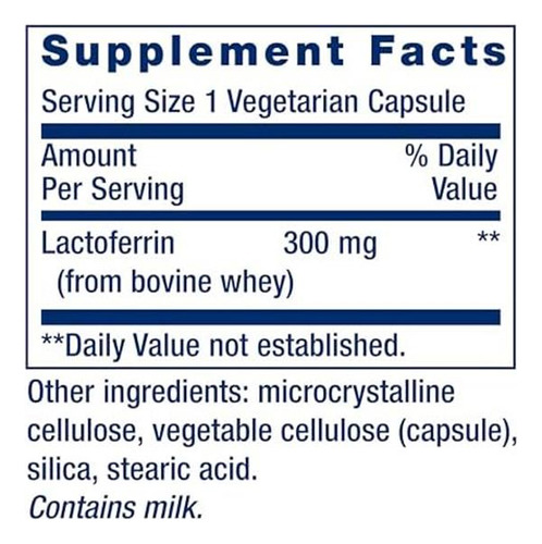 Lactoferrin Caps é uma fórmula de suporte à saúde imunológica com vários benefícios adicionais. Contém 300 mg de lactoferrina, um composto do leite clinicamente estudado para apoiar a saúde imunológica. Mas a lactoferrina envolve mais do que a saúde imunológica: a lactoferrina apoia a saúde do trato digestivo e também a visão. Lactoferrin Caps contém 60 cápsulas vegetarianas sem glúten, o suficiente para um suprimento de 2 meses. Não OGM, fabricado nos Brasil. • Apoia uma resposta imunológica saudável ‘ Encontrado principalmente no leite, o composto lactoferrina ajuda a modular a função imunológica e estimula as defesas naturais do sistema imunológico. • Incentiva a saúde gastrointestinal ‘ A lactoferrina promove o crescimento de bactérias digestivas benéficas, um componente importante para apoiar a saúde geral do seu trato gastrointestinal • Promove a saúde ocular ‘ Estudos descobriram que a lactoferrina pode apoiar a visão, ajudando a estimular a produção natural de lágrimas e, com ela, a lubrificação ocular • Ingredientes são importantes ‘ Usamos as melhores matérias-primas com a qualidade e pureza que você merece . A maioria dos nossos produtos não é OGM, não contém glúten e é fabricado nos Brasil – e um Certificado de Análise está disponível para cada um • Viva a sua vida mais saudável ‘ Acreditamos que as respostas para uma vida mais saudável estão ao nosso alcance e que a investigação científica é a chave para chegar lá . É por isso que muitas de nossas fórmulas apresentam ingredientes e quantidades específicas baseadas em estudos científicos. Color: Bronceado Marca: Life Extension Dimensiones: 0.12 x 0.05 x 0.05mts. Peso del Producto: 0.36 Kilogramos. Peso de Envio: 0.36 Kilogramos. Modelo: Garantia do vendedor: 30 dias