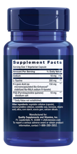 L-taurina 300 mgs, Sal de dissódio pqq (pyrroloquinoline quinone) 10 mgs, Sódio 18 mgs, Ácido r-lipóico (como microencapsulado bio-enhanced ® estabilizado na-rala sódio r-lipoate) 150 mgs |