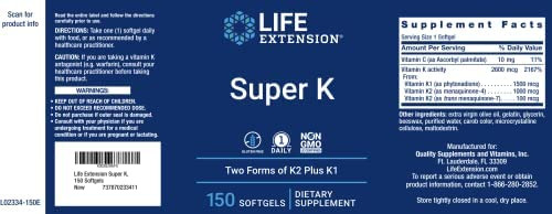 Apenas uma cápsula softgel diária de Life Extensions SuperK fornece 100 mcg de vitamina K-2 (MK-7), 1.000 mcg de vitamina K-2 (MK-4) e 1.500 mcg de vitamina K 1.