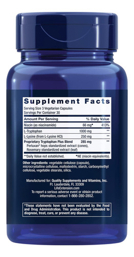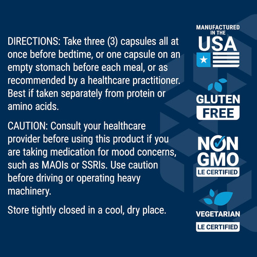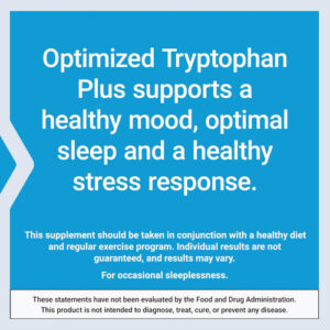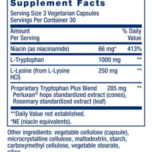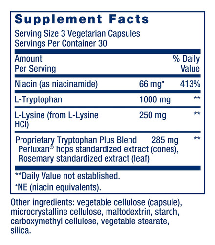 Seu corpo necessita do aminoácido essencial triptofano para produzir e manter níveis saudáveis ??de serotonina. Mas seu corpo não consegue produzir triptofano sozinho. Nosso Triptofano Plus Otimizado fornece 1.000 mg de L-triptofano de alta qualidade por porção para estimular um humor saudável, ajudar a apoiar o sono ideal e promover uma resposta saudável ao estresse. Ao promover níveis saudáveis ??de serotonina, o L-triptofano também promove a saciedade para ajudar a apoiar o controle de peso saudável. Lúpulo, L-lisina e niacina estão incluídos neste suplemento para dormir para apoiar a atividade saudável do triptofano no corpo e promover a função celular saudável. Este suplemento deve ser tomado em conjunto com uma dieta saudável e um programa regular de exercícios. Os resultados individuais não são garantidos e os resultados podem variar.