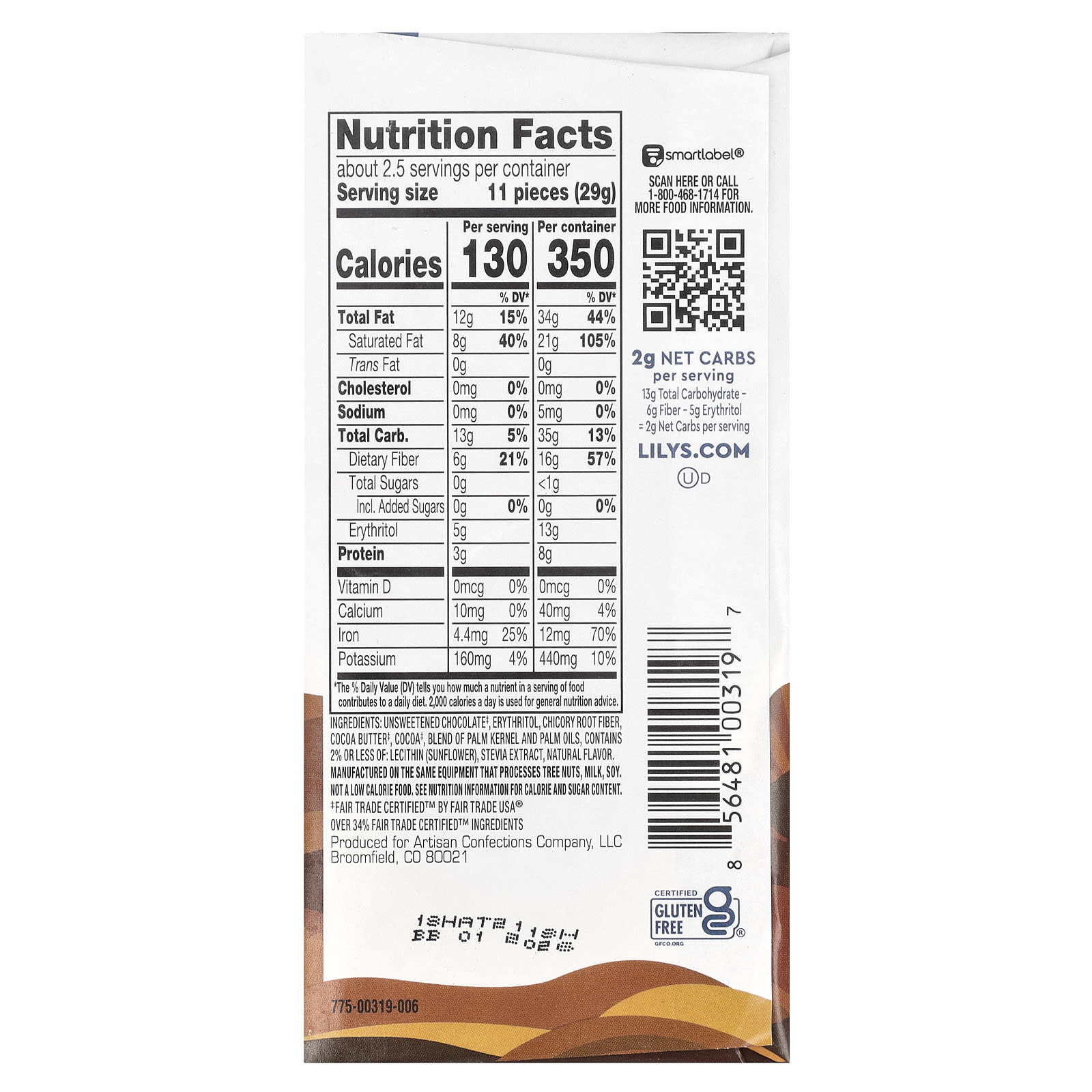Chocolate não adoçado‡, eritritol, fibra da raiz de chicória, manteiga de cacau‡, cacau‡, mistura de palmiste e óleos de palma, contém até 2% de: lecitina (girassol), extrato de estévia, sabor natural.