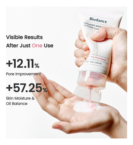 Espuma 2 em 1 que combina máscara de poros e limpador em um. Experimente uma limpeza suave e eficaz e um cuidado suave dos poros com a fórmula elástica exclusiva da Biodance enriquecida com colágeno. – LIMPADOR E CUIDADO DOS POROS 2 EM 1: combinando o poder de um limpador de espuma e uma máscara de lavagem que refina os poros, esta fórmula inovadora 2 em 1 remove facilmente as impurezas e melhora a textura da pele. Ele limpa profundamente os poros entupidos, deixando sua pele revigorada e revitalizada, sem a necessidade de etapas extras! – LIMPEZA PROFUNDA E SUAVE: Projetado para todos os tipos de pele, incluindo peles sensíveis, esse limpador fornece uma limpeza completa sem remover a umidade. Ele remove com eficácia o excesso de oleosidade, sujeira e impurezas, ajudando a refinar a aparência dos poros, promovendo uma tez mais clara e suave. – FÓRMULA ELÁSTICA: Ao contrário dos produtos de limpeza tradicionais, esta fórmula apresenta uma textura pegajosa exclusiva que adere à pele, garantindo uma adesão profunda para uma remoção eficaz de sujeira e óleo. Ele elimina suavemente o acúmulo sem esfregar com força, tornando-o perfeito para uso diário sem irritação. – COLÁGENO DE PESO MOLECULAR ULTRABAIXO: infundido com o colágeno de peso ultrabaixo molecular 243Da exclusivo da Biodance, esse limpador não apenas limpa, mas também oferece hidratação profunda e benefícios de tonificação da pele. Ajuda a restaurar a elasticidade, deixando a pele firme, suave e revigorada após cada lavagem. – FÓRMULA DE PH BALANCEADO: Formulado com um pH levemente ácido, esse limpador equilibra os benefícios dos limpadores ácidos e alcalinos sem suas desvantagens. Ajuda a manter a barreira natural da pele ao mesmo tempo que dissolve eficazmente o excesso de sebo e as impurezas, garantindo uma tez saudável e equilibrada.