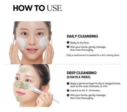 – COMO USAR MÁSCARA OU LIMPADOR Use como máscara de argila a cada 3 dias com um pincel de silicone aplique, deixe secar e enxágue bem. Para uma limpeza diária, ensaboe com água e massageie suavemente na pele antes de enxaguar.