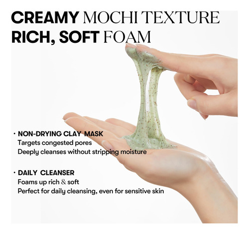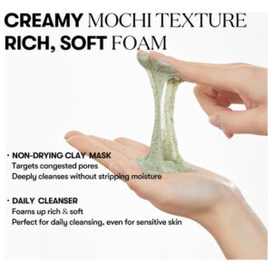 MÁSCARA E LIMPADOR DE ARGILA 2 EM 1 A textura cremosa de mochi desliza sem esforço, funcionando como máscara de argila que não seca e limpador diário de espuma. Deixa a pele limpa, hidratada e revigorada sem irritação.