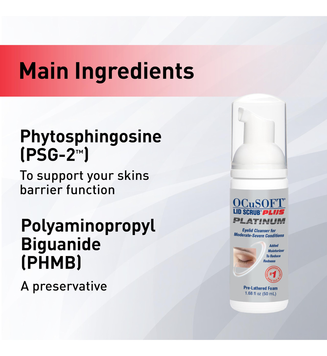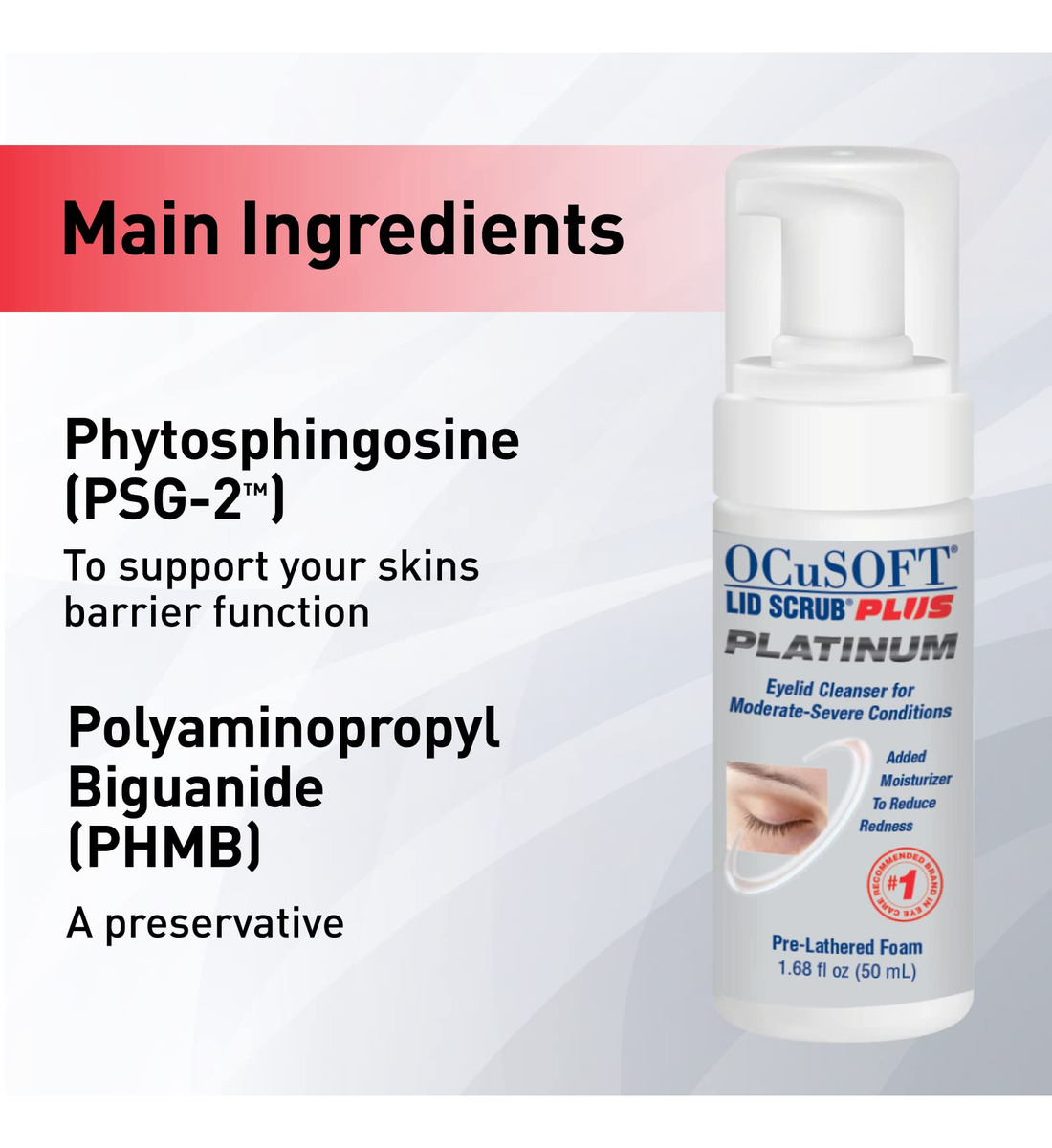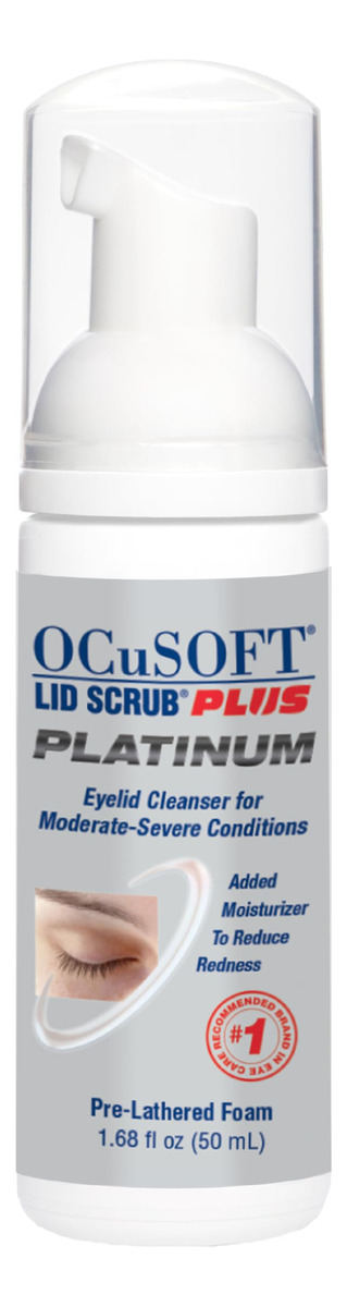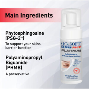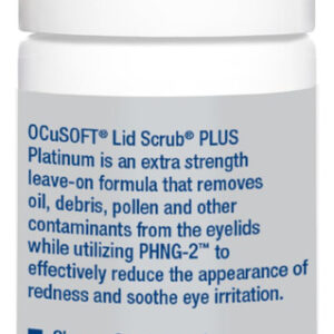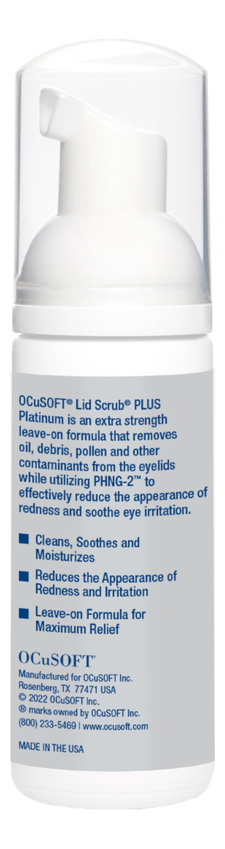 O OcuSoft Lid Scrub Plus Platinum é um limpador de pálpebras sem enxágue extra forte com propriedades que aliviam eficazmente a irritação. – O OcuSoft Lid Scrub Plus Platinum é um limpador de pálpebras extra forte. – O PSG-2 é um agente de fixação de água que imita a camada natural da pele para aumentar a hidratação ao longo do dia. – Fórmula econômica de espuma pré-ensaboada (50 ml)