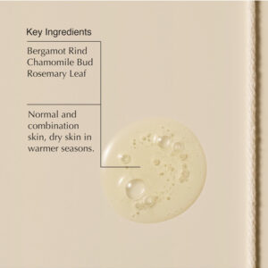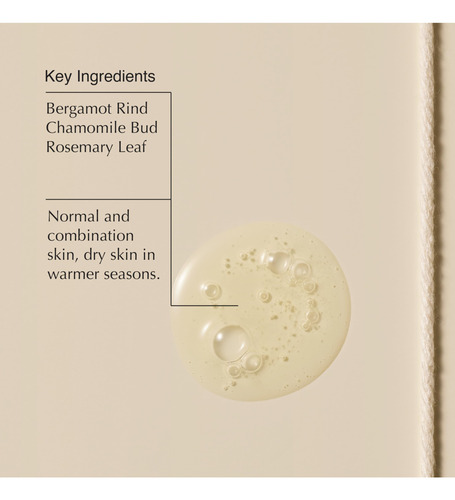 Chave Ingredientes: casca de bergamota, broto de camomila, folha de alecrim. – Modo de usar: De manhã e à noite, despeje nas mãos limpas e ensaboe. Massageie no rosto e pescoço e enxágue abundantemente com água morna.