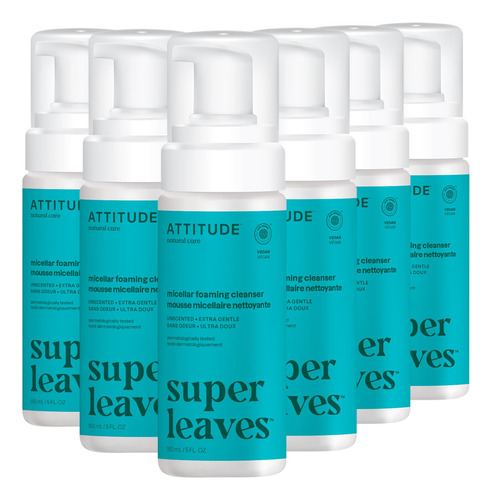 Limpador facial com espuma micelar ATTITUDE, verificado pelo EWG, testado dermatologicamente, à base de plantas e minerais, vegano, sem perfume, 5 oz (pacote com 6) – Verificado pelo EWG: ingredientes limpos e total transparência – INGREDIENTES DE ORIGEM NATURAL: Formulado com 98,3% de ingredientes de origem natural*, incluindo extrato de folhas de mirtilo para restaurar a elasticidade da pele e preservar sua umidade natural – ALTO DESEMPENHO: enriquecido com vitaminas e minerais agrião rico em agrião e agrião indiano com propriedades purificantes e revitalizantes – TESTADO DERMATOLOGICAMENTE – VEGANO
