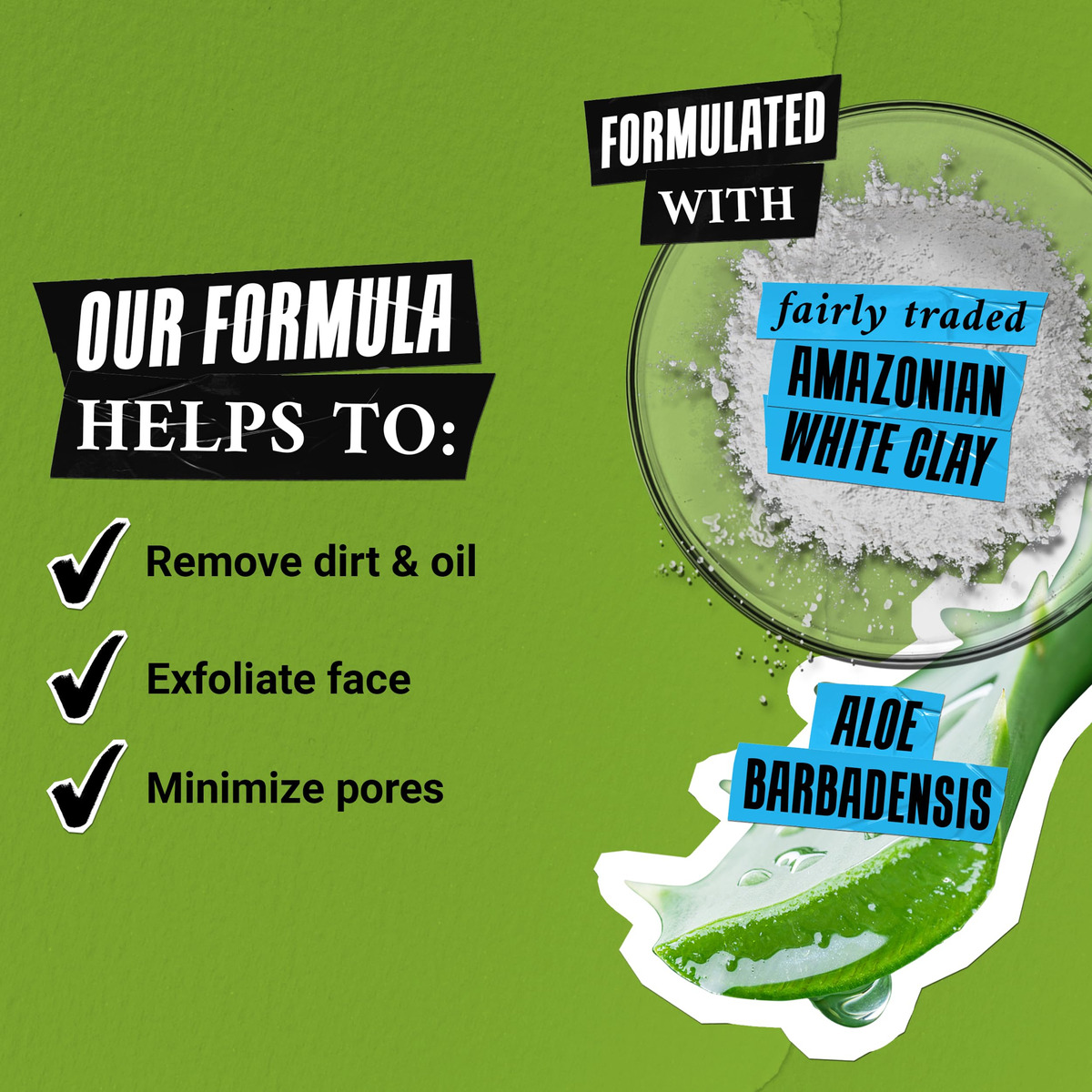 Argila branca amazônica, conhecida por ajudar a absorver o excesso de óleo, desintoxicar a pele e suavizar o Aloe Barbadensis. – Sem parabenos e sem fragrância. Para pele oleosa e pele normal.