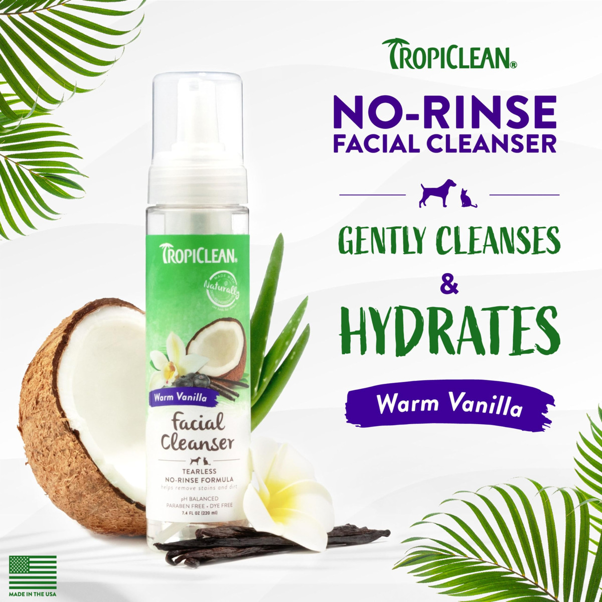 Limpador facial sem água TropicLean Warm Vanilla para cães | Sabonete facial com espuma para cães | Sabonete facial para cães derivado de ingredientes naturais | Adequado para gatos | Fabricado nos EUA | 7,4 onças. – FÓRMULA SEM ENXÁGUE Para uma limpeza rápida e fácil durante os dias intermediários, confie no sabonete facial com aroma de coco e baunilha para cães e gatos. – FRESH & CLEAN Um limpador facial de espuma para cães e gatos sem lágrimas que deixará sua pelagem hidratante limpo e limpo. – INGREDIENTES PARA SE SENTIR BEM Nosso shampoo facial hidratante para cães e gatos é derivado de ingredientes naturais, como pepino, baunilha e coco para uma pelagem macia e sedosa. – O limpador facial sem enxágue aprovado pelos pais dos animais de estimação não contém parabenos, corantes, sabonetes e crueldade e é adequado para uso em cães e gatos com 12 semanas ou mais. – TROPICLEAN Para uma experiência tropical, combine-o com nosso xampu sem água para cães e toalhetes de limpeza profunda.