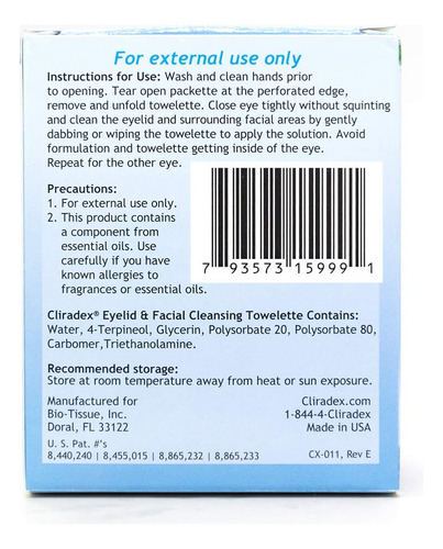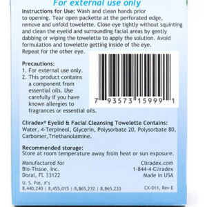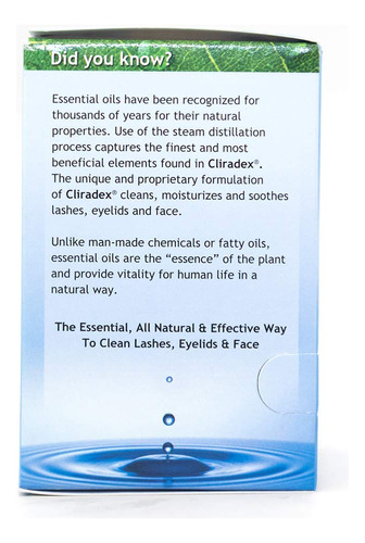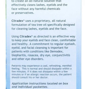 Toalhetes Cliradex – Limpador natural de rosto, cílios e pálpebras – Toalhetes para Demodex, blefarite, Mgd e pálpebra vermelha irritada – Extrato de óleo de melaleuca. – NOSSO COMPROMISSO COM SUA SEGURANÇA E O MEIO AMBIENTE: os toalhetes naturais para pálpebras CLIRADEX são lenços faciais naturais feitos sem parabenos, sulfatos, fragrâncias, cores artificiais, álcool, preenchimentos e é vegano e nunca testado em animais. Nossos toalhetes de limpeza são derivados de uma fonte sustentável de óleo de melaleuca. – ANTIDEMODEX: elimina os ácaros dos cílios Demodex associados à rosácea, blefarite e outras irritações oculares. Toalhetes faciais especialmente formulados para manter a higiene adequada das margens das pálpebras. Nossa fórmula é extraída do óleo de melaleuca que limpa as pálpebras, os cílios e o rosto enquanto mata alguns ácaros associados a pálpebras inflamadas e outras doenças da pele. – Toalhetes de limpeza profunda: use-os após um removedor de maquiagem para limpar os detritos restantes e os óleos residuais. Seu principal componente, o 4-Terpineol, do óleo de melaleuca, penetra profundamente na pele para limpá-la. – APOIADO PELA CIÊNCIA, FEITO POR UM OFTALMOLOGISTA, FABRICADO NOS EUA: A fórmula científica patenteada do Dr. Tseng isola o 4-Terpineol, o principal componente do óleo de melaleuca (TTO), que é eficaz contra inflamações oculares. Usar produtos com TTO puro diretamente na margem da pálpebra do olho ou ao redor dela não é seguro e pode causar irritação ocular. – O QUE ESPERAR: Como qualquer outro produto da árvore do chá, você pode sentir uma sensação de formigamento, que diminuirá com o tempo e com o uso frequente. Cliradex não danifica nem resseca a pele. Se a sensação for muito forte, você já pode ter a pele comprometida (como colocar álcool em uma ferida) ou pode estar tendo uma reação ao óleo essencial.