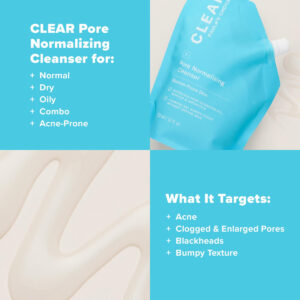 O limpador normalizador de poros CLEAR não é como outros limpadores de acne; é totalmente não irritante e não causa ressecamento ou descamação. Na verdade, esse gel de limpeza tem um toque sedoso que funciona rapidamente para remover o excesso de óleo e detritos que podem obstruir os poros e causar erupções cutâneas. Remove com cuidado e rapidez o excesso de óleo e detritos superficiais que contribuem para a acne.