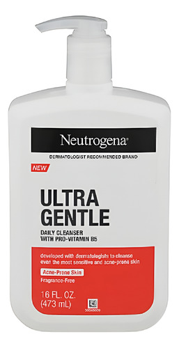 Frasco de 16 onças líquidas de sabonete facial Neutrogena Ultra Gentle Daily Cleansing para peles sensíveis e com tendência a acne que limpa a pele em profundidade de maneira suave, mas eficaz para ajudar a eliminar o excesso de óleo, sujeira, bactérias e maquiagem.