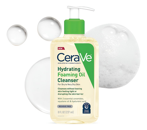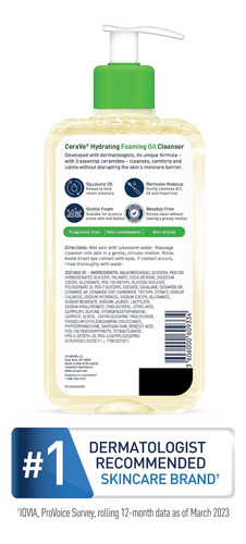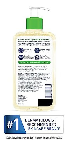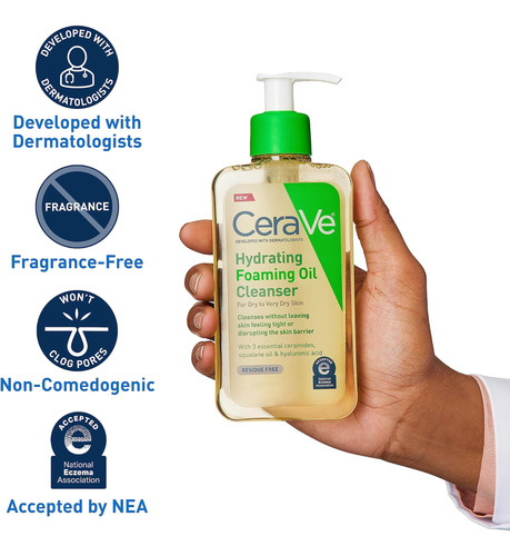 Desenvolvido com dermatologistas, o limpador de óleo espumante CeraVe é formulado para peles secas a muito secas. Também é adequado para peles sensíveis, com tendência atópica e pele de bebês. Este limpador hidratante pode ser usado como limpador facial e corporal para eczema. Não comedogênico. Sem perfume Esta fórmula espumante de lavagem facial, que contém 3 ceramidas essenciais 1, 3, 6-II, ajuda a manter a barreira natural da pele, garantindo que ela não fique esticada. Ele mantém a pele hidratada. Adequado para uso no rosto e no corpo.
