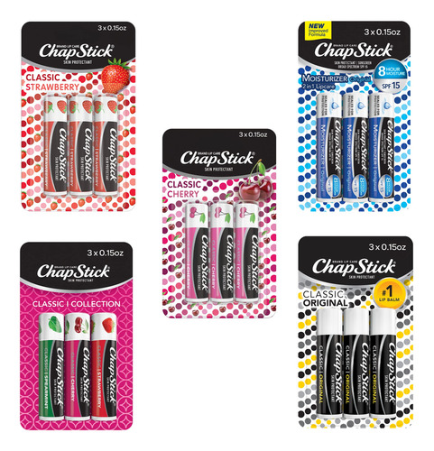 Pacote de tubos de protetor labial com sabor ChapStick Classic Collection, hidratante labial – 0,15 onças (caixa com 5 pacotes de 3) – Caixa com cinco pacotes de três tubos de protetor labial com sabor ChapStick Classic Collection de 0,15 onças – Suaviza e hidrata, deixando os lábios sedosos e macios – O pacote inclui: tubos de protetor labial ChapStick Original, Strawberry ChapStick, Spearmint, ChapStick Original com SPF 15 e tubos de protetor labial Cherry – Pequenos tubos de ChapStick aromatizado, como protetor labial de morango, que são portáteis e fáceis de guardar nas gavetas e bolsas da mesa – Aplique este hidratante labial conforme as instruções – Faz um presente ideal para qualquer ocasião
