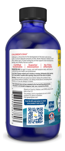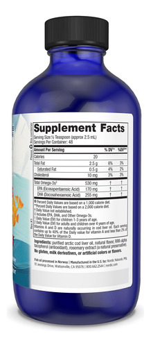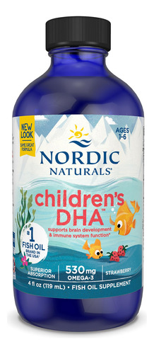 O Nordic Naturals Children's DHA, o ômega-3 infantil mais vendido nos EUA, tem 530 mg de ácidos graxos essenciais ômega-3 por porção, incluindo 170 mg de EPA e 255 mg de DHA, essenciais para a função cerebral*. #1 O líquido de DHA para crianças pode ser administrado como está ou adicionado a alimentos e bebidas, e é uma maneira fácil de crianças de 1 a 6 anos obterem ômega-3 essenciais sem pílulas. Derivado exclusivamente de bacalhau ártico 100% selvagem (Skrei), o delicioso sabor de morango certamente agradará! Como todos os produtos da Nordic Naturals, nosso DHA infantil é testado em laboratório e supera os rígidos padrões internacionais de pureza e frescor. A Nordic Naturals está comprometida em fornecer os nutrientes essenciais à saúde mais seguros e eficazes do mundo. O Nordic Naturals é o óleo de peixe #1 mais vendido nos EUA, com mais de 150 produtos em uma variedade de sabores e doses para atender às necessidades nutricionais de todos. Nós nos esforçamos para fornecer produtos de alta qualidade diretamente do fabricante para sua casa por meio de métodos sustentáveis e usando apenas ingredientes naturais. A Nordic Naturals incorpora práticas éticas e socialmente responsáveis em relação ao meio ambiente, transparência corporativa, parcerias filantrópicas e educação. Nossa inovação contínua é a prova de que, quando os valores estão alinhados com a ação, grandes coisas podem acontecer.