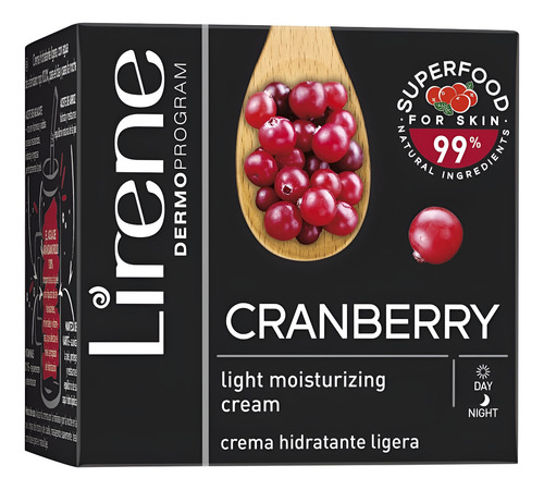 O creme hidratante Lirene Cranberry Light com 100% de água de cranberry nutre profundamente a pele durante o dia e a noite.