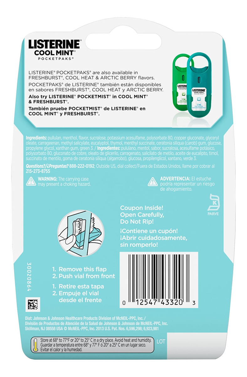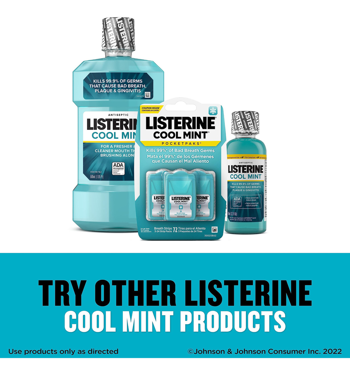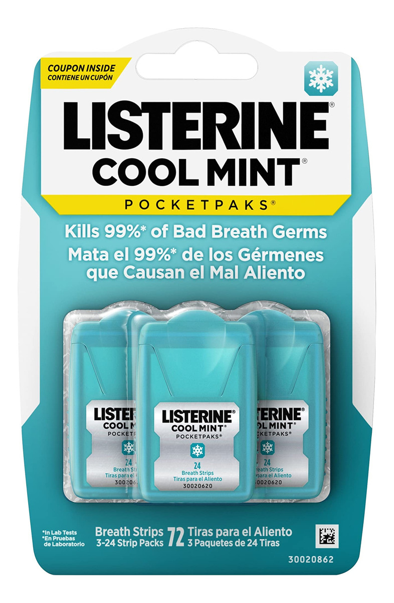 Listerine Cool Mint Pocketpaks Breath Strips Kills Bad Breath Germs, 24-Strip Pack, 3 Pack – 3 packs containing 24 strips each of Listerine Cool Mint PocketPaks Bad Breath Strips to kill bad breath germs effectively while freshening breath on-the-go with a Cool Mint flavor – Mint breath strips kill 99 percent of germs that cause bad breath, according to laboratory tests, and leave you with fresh breath for important occasions and meetings – Discover fresh breath in one convenient step with a portable pack of mint breath freshener strips. These pocket-sized fresh breath strips dissolve instantly to kill germs that cause bad breath while leaving your mouth feeling clean and refreshed – Get bad breath germ protection on-the-go with these conveniently portable mint fresh breath strips. Perfect for easy-to-access fresh breath and to kill bad breath germs while youre anywhere – To use, remove one oral care strip from the convenient carrying case, place the strip on your tongue, and let it dissolve. Use as needed to freshen breath and kill bad breath germs