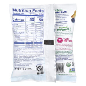 Puffs de Mirtilo Orgânicos Lanches deliciosamente crocantes de milho orgânico polvilhados com mirtilo que derretem na boca para proporcionar uma alimentação segura. Ideal para o lanche da primeira etapa.