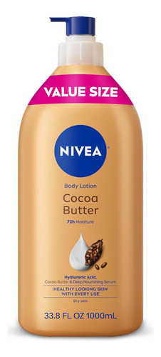 A loaao corporal NIVEA Cocoa Butter 1000ml a ideal para pele seca, proporcionando hidrataaao profunda por ata 72 horas. Sua farmula exclusiva contam manteiga de cacau, acido hialuranico e sarum nutritivo, deixando a pele macia, radiante e com aparancia saudavel desde a primeira aplicaaao. Dermatologicamente testada, a perfeita para uso diario e adequada para todos os tipos de pele. O frasco com pump facilita a aplicaaao e a feito com plastico reciclado, contribuindo para o meio ambiente. Textura leve, rapida absoraao e sem sensaaao oleosa. Medidas do frasco 10 cm x 7,5 cm x 25 cm. Peso 1 kg. Escolha NIVEA Cocoa Butter para uma hidrataaao intensa, duradoura e uma pele visivelmente mais bonita. Garantia do vendedor: 30 dias