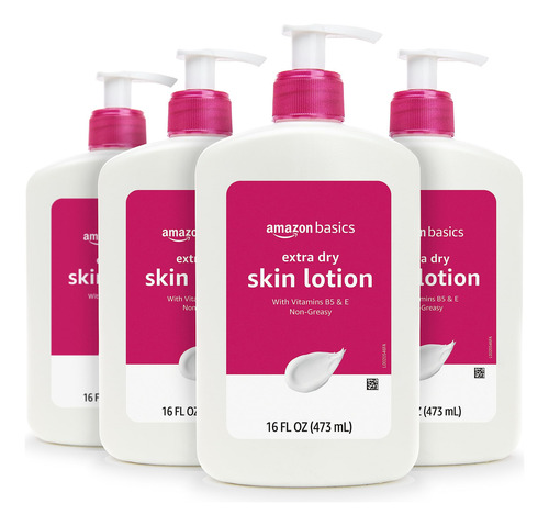 Loção para pele extra seca Amazon Basics com vitaminas B5 e E, aroma limpo, 16 ml (pacote com 4) (anteriormente Solimo) — Quatro frascos de loção corporal de 16 onças fluidas para ajudar a acalmar e proteger a pele extremamente seca — A embalagem é transitória e pode variar da imagem — Fórmula não oleosa, sem parabenos, com vitaminas B5 e E — Não testada em animais. Feito nos Brasil com componentes americanos e estrangeiros. – Se você gosta da loção de terapia avançada Lubriderm, convidamos você a experimentar a loção para pele extra seca Amazon Basics