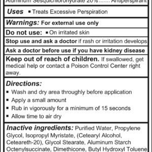 Fórmula nova e aprimorada! A Loção ZeroSweat agora está ainda mais forte! E é uma garrafa maior! Mais poder de bloqueio do suor com cada tubo! – PARE DE TRANSPIRAR EXCESSIVAMENTE | Mãos, pés e rostos suados se encontram à altura. A transpiração excessiva não é apenas para as axilas. Ele foi projetado especificamente para mantê-lo seco em momentos de necessidade, qualquer que seja a configuração. – COMO FUNCIONA | Nossa fórmula exclusiva permite que o ZeroSweat seja absorvido pelas glândulas sudoríparas, fazendo com que as glândulas parem de produzir suor e dure até 7 dias de proteção. Os antitranspirantes típicos apenas absorvem o suor ou o reduzem. – ANTITRANSPIRANTE DE MAIOR RESISTÊNCIA | O ZeroSweat fornece o antitranspirante de maior resistência sem receita médica. Projetado especificamente para interromper a transpiração excessiva por mais de uma semana com uma aplicação. Aumentador de confiança para devolver sua vida. – RAZÕES PARA AMAR ZEROSWEAT | Fabricado em uma instalação com certificação GMP nos EUA. Oferece proteção clínica e não obstrui os poros como outros antitranspirantes. Evite procedimentos, cirurgias ou injeções caras para parar de suar. – USE-O EM TODAS AS OCASIÕES | Consiga mãos secas para suas atividades favoritas. Ótimo para alpinistas, jogadores, dançarinos de pole, acroioga, programadores, levantadores de peso, ciclistas, ginastas, artistas musicais e muito mais. Qualquer coisa para a qual você usa suas mãos..