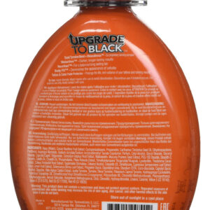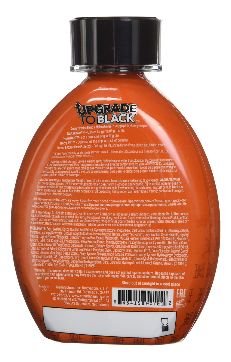 O upgrade para preto levará seu bronzeado ao próximo nível! A atualização para preto oferece uma cor escura superior em apenas uma hora, enquanto os estimuladores Quad Tanning permitem resultados mais duradouros, mais rápidos e mais escuros. Não precisa esperar, tempo é dinheiro, baby! Você acabou de receber o upgrade! Grandes quantidades de DHA, bronzeadores naturais e cosméticos produzem resultados de bronzeamento extremamente escuros, imediatos e progressivos para um toque instantâneo de cor Quad Tirosine Blend + MelanoBronze – Estimule e aumente a formação de melanina para acelerar o processo de bronzeamento Melactiva – Sintetizador de melanina para resultados mais escuros e duradouros Nouritan – Estimula a atividade da tirosina e promove um bronzeado uniforme e duradouro. – Reduz a aparência da celulite e promove firmeza. Protetor de tatuagem e desbotamento colorido – prolonga a vida e o brilho de suas tatuagens e bronzeamento resultados Açaí – Antioxidantes de superfrutas – Altas quantidades de DHA, bronzeadores naturais e cosméticos produzem resultados de bronzeamento extremamente escuros, imediatos e progressivos para um toque instantâneo de cor – Melactiva – Sintetizador de melanina para resultados mais escuros e duradouros – Nouritan – Estimula a atividade da tirosina e promove um bronzeado uniforme e duradouro – Mistura quádrupla de tirosina + MelanoBronze – Estimula e aumenta a formação de melanina para acelerar o tanoeiro processo de nidificação