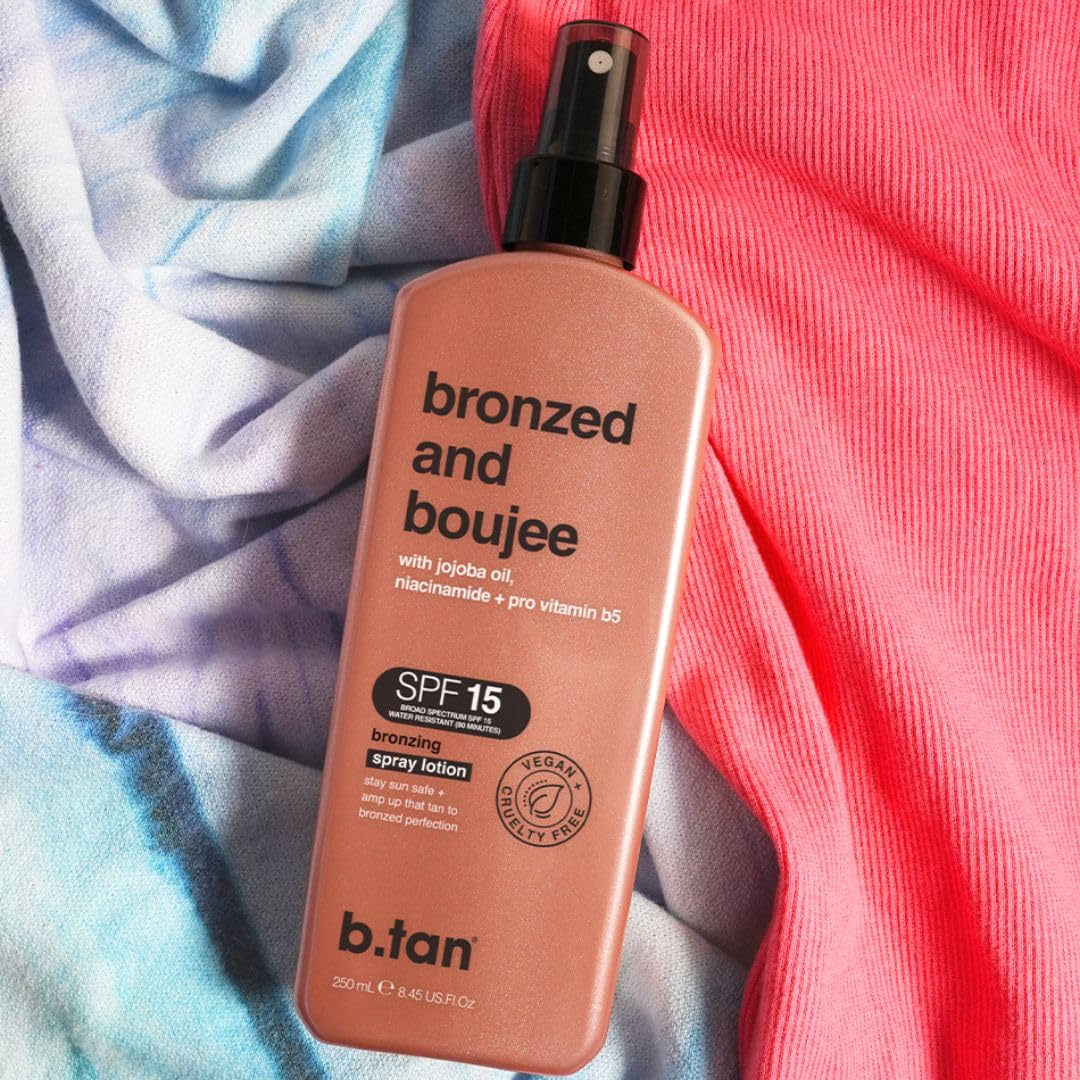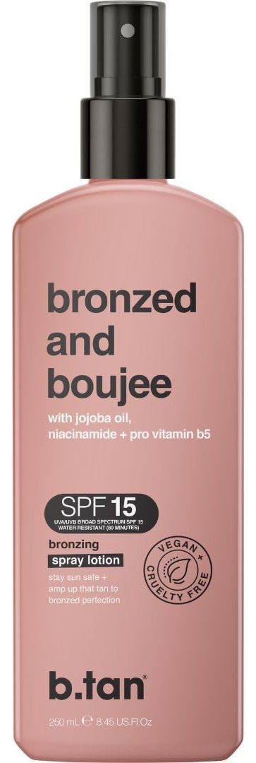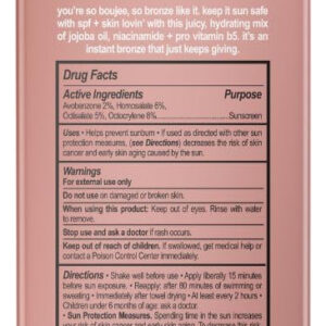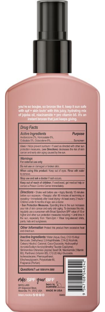 uma loção spray bronzeadora colorida com SPF 15 para proteção solar enquanto você brilha. Misturada com óleo de jojoba, niacinamida e pró-vitamina b5 – LOÇÃO BRONZEADORA EM SPRAY. Sou colorida, então sou perfeita para quando você quer um toque instantâneo de bronzeado – PROTEÇÃO UV. Eu tenho FPS 15 de amplo espectro UVA/UVB para mantê-lo protegido – FÁCIL DE USAR. Agite bem antes de usar. aplique generosamente 15 minutos antes da exposição ao sol. Reaplique após 80 minutos nadando ou suando ou imediatamente após secar a toalha – pelo menos a cada 2 horas. Crianças menores de 6 meses de idade: consulte um médico. – SKIN LOVIN' INGREDIENTES. Sou infundido com óleo de jojoba, niacinamida e pró-vitamina b5 para manter sua pele tão hidratada – Adequado para veganos. Sou livre de coisas desagradáveis e adoro animais, então sou vegana e livre de crueldade – FEITO NOS EUA: Feito por especialistas em bronzeamento aqui nos EUA. Nossas instalações de produção de última geração usam apenas ingredientes da mais alta qualidade para que você saiba que sua pele está bem cuidada.