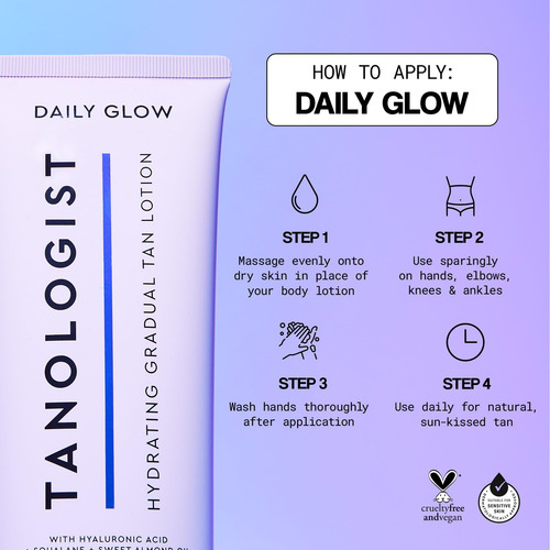 condiciona profundamente a pele: uma loção bronzeadora hidratante gradual contendo óleo de amêndoa doce para nutrir e proteger a barreira cutânea e semente de groselha preta para acalmar a inflamação e ajudar a pele a reter a umidade – Não comedogênica Fórmula: Este autobronzeador não comedogênico foi testado e aprovado por dermatologistas, por isso é seguro para peles sensíveis. Todos os produtos Tanologist estão isentos de ingredientes irritantes que causam erupções cutâneas e poros entupidos