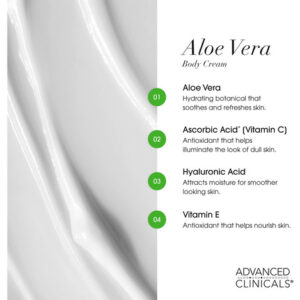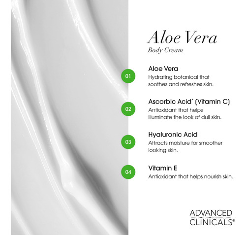 Advanced Clinicals Aloe Vera é essencial para pessoas com pele seca ou cansada! Feito com vitamina C, ácido hialurônico, vitamina E e outros ingredientes naturais, esse aloe vera para a pele é essencial para o seu conjunto de cuidados com a pele. Este creme corporal também contém ácido hialurônico, que proporciona hidratação instantânea à pele, e vitamina C, ótima para manchas da idade e manchas escuras. Para obter melhores resultados, use após usar o limpador facial e o sérum facial. – LOÇÃO DE ALOE VERA Aloe Vera é uma planta versátil que tem sido usada há séculos e é conhecida por seus inúmeros benefícios para o cuidado da pele. Aloe Vera é um ótimo hidratante natural que pode ajudar a prevenir rugas, remover acne e manchas, minimizar cicatrizes, acalmar a pele seca ou queimada pelo sol e muito mais. O gel de aloe vera contém compostos ricos em água que fornecem excelente hidratação natural sem ser excessivamente oleoso, tornando-o adequado para todos os tipos de pele. – INGREDIENTES EFICAZES A loção corporal de aloe vera da Advanced Clinicals é formulada com a combinação perfeita de ingredientes antienvelhecimento, calmantes e clareadores eficazes, incluindo vitamina C, extrato de chá verde, óleos de frutas, ácido hialurônico, vitamina E e muito mais. A vitamina C ajuda a clarear o tom da pele. Aloe Vera acalma e hidrata a pele. O ácido hialurônico hidrata profundamente a pele, proporcionando hidratação duradoura. A vitamina E nutre a pele enquanto ajuda a protegê-la contra os radicais livres e os danos causados pelos raios UV. – FÓRMULA TERAPÊUTICA + TESTADA por dermatologistas, clinicamente testada e testada contra alergias que é facilmente absorvida profundamente pela pele, deixando-a hidratada e sedosa durante todo o dia. Aloe Vera e Ácido Hialurônico trabalham juntos para promover a regeneração das células da pele, oferecendo hidratação extra e proteção contra a barreira da pele, promovendo células mais saudáveis e uma tez mais vibrante. Rico o suficiente para ser um creme corporal de longa duração, mas também suave o suficiente para ser usado como hidratante facial diário. – PELE RADIANTE Este creme calmante e recuperador de aloe vera é infundido com vitamina C, ácido hialurônico e óleo de vitamina E, que ajudam a refinar a aparência da pele envelhecida, ajudam a estimular a produção de colágeno para melhorar a elasticidade e firmeza da pele e também iluminam o tom geral da pele. O Aloe Vera também funciona muito bem como um esfoliante natural, ajudando a esfoliar a pele para remover as células mortas da pele, promovendo uma tez mais lisa, brilhante e radiante. – ACALME, RESTAURE e RENOVE. Fabricado em nosso laboratório inspecionado pela FDA em Chicago, Brasil. Seja qual for o seu tipo de pele, a Advanced Clinicals tem sua solução natural. Sooth + Restaure um brilho mais jovem à sua pele com o poder do Aloe Vera e de fórmulas cientificamente comprovadas. Na Advanced Clinicals, temos o compromisso de ajudar você a se sentir confiante em sua pele. Priorizamos sua experiência positiva e a garantimos com soluções comprovadas.