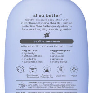 Loção corporal eos Shea Better — caxemira de baunilha, hidratante para a pele 24 horas, leve e não oleosa, feita com karité natural, vegana, 16 fl oz — Loção corporal SHEA BETTER: nosso aroma doce e suave de caxemira de baunilha contém notas perfumadas de baunilha batida, almíscar macio e caramelo aconchegante. A loção corporal de hidratação de 24 horas eos é feita com ingredientes naturais para deixar sua pele macia da cabeça aos pés Dedo do pé. – Hidratação 24 horas para seu corpo: acalme e proteja sua pele com nossa loção leve e não oleosa. Sem resíduos pegajosos ou peso, apenas hidratação durante todo o dia e pele macia. — Suavize: aplique esta loção corporal de rápida absorção e deliciosamente perfumada na pele recém-limpa, prestando atenção especial às áreas secas e ásperas. Relaxe bem e faça o resto. – CUIDADO SUSTENTÁVEL DA PELE: proteja e hidrate sua pele com 7 óleos nutritivos e manteigas, incluindo manteiga de karité natural e óleo de karité. Nossa coleção de fragrâncias incríveis deliciará a aplicação e durará o dia todo na pele – MANTEIGA DE KARITÉ TOTALMENTE NATURAL: os produtos eos têm manteiga de karité 100% natural, produzida de forma selvagem e de origem sustentável para que a pele fique hidratada, protegida e macia. Somos livres de parabenos, ftalatos e glúten. Testado dermatologicamente. Vegano. Hipoalergênico. Certificado pela PETA. Nenhum produto testado em animais.