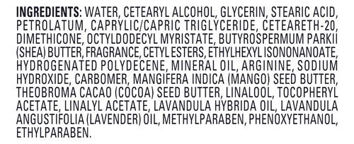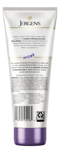 Loção corporal e para mãos Jergens Lavender Body Butter, hidratante para mulheres, 7 onças (pacote com 1), com óleos essenciais para hidratação indulgente. Branco — FAÇA UMA PAUSA PARA NUTRIR SUA PELE: os hidratantes corporais Jergens Triple Butter apresentam uma mistura ultra-hidratante de manteigas de karité, cacau e manga e suavizam a pele — DESFRUTE DE AROMAS ATRAENTES: os hidratantes corporais Jergens oferecem uma mistura ultra-hidratante de manteiga de karité, cacau e manga óleo essencial curativo para oferecer a indulgência perfeita para seu corpo e mente – ACALME E SUAVIZE: com nossa mistura exclusiva de óleo essencial de lavanda e manteigas corporais – CONFIÁVEL POR MAIS DE 100 ANOS: A marca Jergens se dedica a produtos hidratantes de alta qualidade há mais de um século – a embalagem pode variar.
