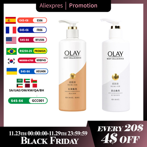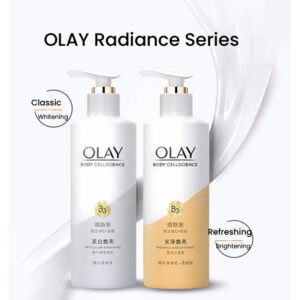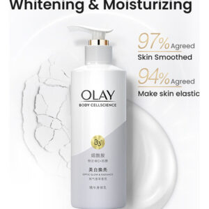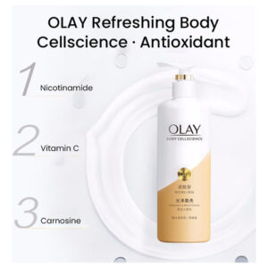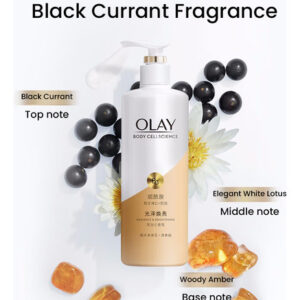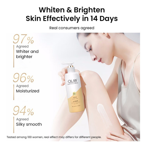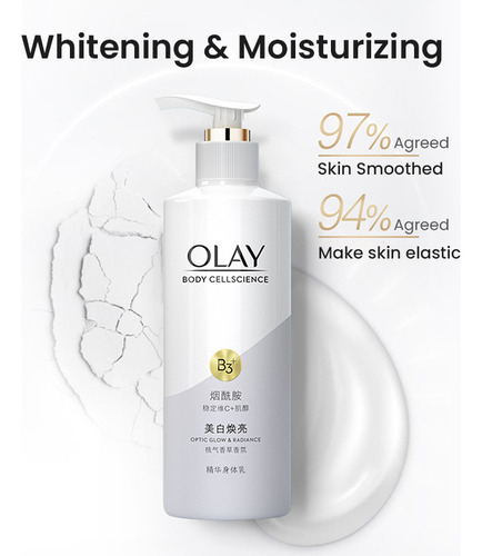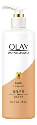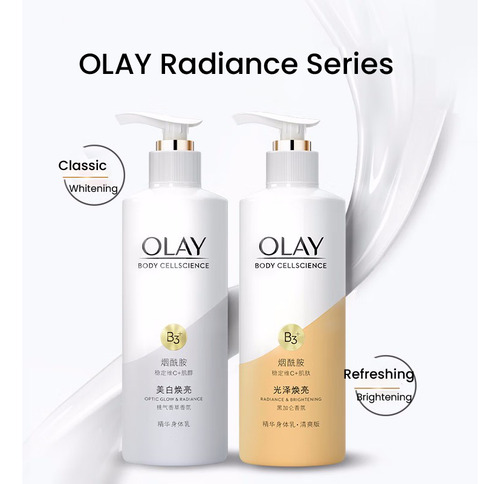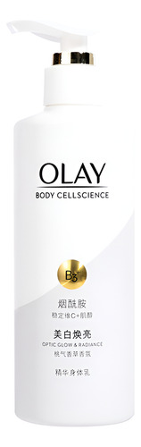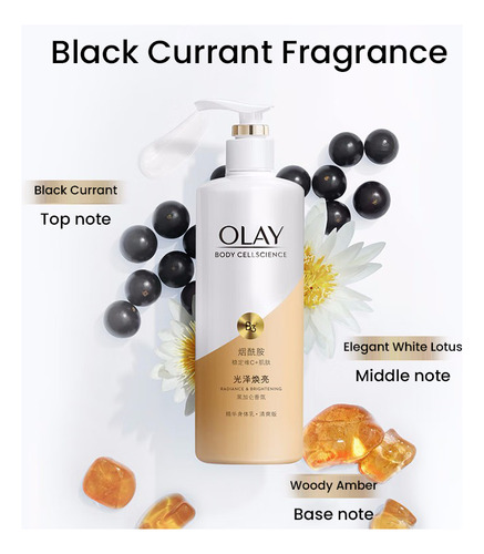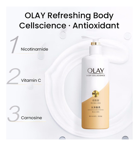 Loção corporal OLAY Body Cellscience 250 ml Conteúdo líquido Versão de brilho e brilho óptico Ingredientes ativos: niacinamida, vitamina C e inositol Aroma: pêssego branco, jasmim, baunilha fresca Efeitos: clareamento da pele, redução da melanina, antioxidante, hidratante e nutre a pele Versão radiante e iluminadora Ingredientes ativos: niacinamida, vitamina C e miostatina Aroma: groselha preta, Lótus branco, âmbar amadeirado Efeitos: branquear a pele, melhorar o brilho da pele, hidratar a pele
