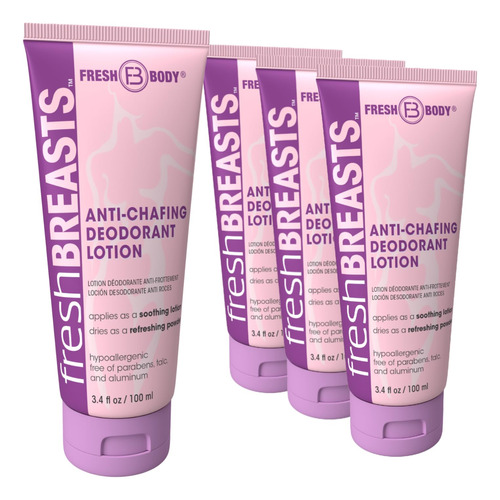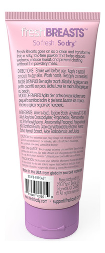 (Pacote com 4) Loção desodorante antiatrito Fresh Body Fresh Breasts para mulheres, 3,4 ml — loção em pó para suor sob os seios, parte interna das coxas e áreas propensas a irritações. Senhoras, afastem-se dos pós sujos. Fresh Breasts é a solução para mulheres – o creme antiatrito ajuda a prevenir a umidade, o suor sob os seios e a sensação desconfortável de suor e pegajosidade causada pela transpiração sob os seios ao longo da linha do sutiã e outras áreas problemáticas propensas a irritações. Ajuda você a se manter limpo e fresco entre os chuveiros. Fresh Breasts foi criado cientificamente para manter você e as meninas secas e reduzir o atrito, para que não haja mais aqueles encontros desconfortáveis e estranhos de braços cruzados. Menopausa, ondas de calor, erupções cutâneas, suores noturnos, irritações nas coxas, temido suor embaixo dos seios. A loção desodorante Fresh Breasts para mulheres acalma onde você realmente precisa. As mulheres agora podem ficar tranquilas, estamos substituindo o temido suor debaixo dos seios por sorrisos! O creme calmante anti-atrito, quando aplicado como uma loção, seca rapidamente em um pó absorvente sedoso e sem grumos. Produto de origem natural com aveia como anti-irritante. Sem perfume, por isso não competirá com seus outros produtos e perfumes. Acalma e ajuda a controlar o suor e o atrito sob os seios, esteja você indo à academia, assistindo a um show, trabalhando muitas horas, tendo uma noite quente, viajando pelo país ou simplesmente enfrentando a rotina diária. Livre de alumínio, parabenos e talco. Hipoalergênico. Não testado em animais, apenas em humanos. Feita nos EUA com materiais de origem global. – (pacote com 4) Loção desodorante antiatrito Fresh Breasts para mulheres, 3,4 ml. O creme calmante antiatrito se aplica como uma loção que seca rapidamente em um pó sedoso e sem grumos que ajuda a absorver a umidade, reduzir a linha do sutiã e o suor nos seios, ajudando a evitar o atrito sem a bagunça pulverulenta. Tamanho conveniente aprovado pela TSA — NÃO APENAS PARA “MENINAS” — Nossa loção corporal em pó não serve apenas para suar debaixo dos seios. Pode ser aplicado a todas as curvas (somente para uso externo). Aplique uma pequena quantidade na pele seca sempre que precisar para ajudar a proteger a pele do atrito e mantê-la seca e sem odores – use nas coxas e axilas, na linha do sutiã, nas dobras e nos rolos cutâneos. – TÃO FRESCO. Muito seco. – Se você é uma xícara A ou DDD+, Fresh Breasts ajuda você a se manter limpa e fresca. O creme anti-atrito ajuda a prevenir a umidade e a sensação desconfortável de suor e pegajosidade causada pela transpiração. Aveia e babosa para acalmar a pele e ajudar a prevenir irritações. Feito sem alumínio, talco ou parabenos. – A SOLUÇÃO PARA MULHERES – Ondas de calor te deixando louca? Menopausa, ondas de calor, erupções cutâneas, suores noturnos, irritações nas coxas, suor nojento nos seios. A loção desodorante Fresh Breasts para mulheres acalma onde você realmente precisa. – REFRESQUE-SE PARA A CURA – Sua compra ajuda a apoiar a pesquisa do câncer de mama. De 1º de abril de 2024 a 31 de dezembro de 2024, a Fresh Body doará a Susan G. Komen $0,25 por cada tubo Fresh Breasts ou pacote On-The-Go de 15 unidades vendido, com uma doação mínima de $3.000 a um máximo de $5.000.