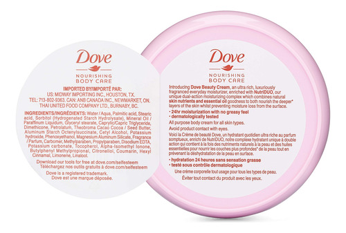 Creme nutritivo de beleza corporal, facial, para mãos e corpo Dove para pele normal a seca para mulheres com hidratação de 24 horas, pacote com 4, 2,53 onças por frasco — FÓRMULA RICA: O creme de beleza Dove nutre a pele para deixá-la bonita — Cuidado diário completo da pele: use-o dia e noite e tenha uma pele macia, macia e sedosa — Adequado para qualquer pele: é perfeito para todos os tipos de pele, incluindo pele oleosa — NÃO OLEOSA: Se você tem pele oleosa, você vai querer um creme corporal hidratante que não seja oleoso; o Creme de Beleza Dove tem uma textura leve, por isso nutre pele sem deixar nenhum resíduo, apenas uma pele macia ao toque que é tão bonita quanto parece