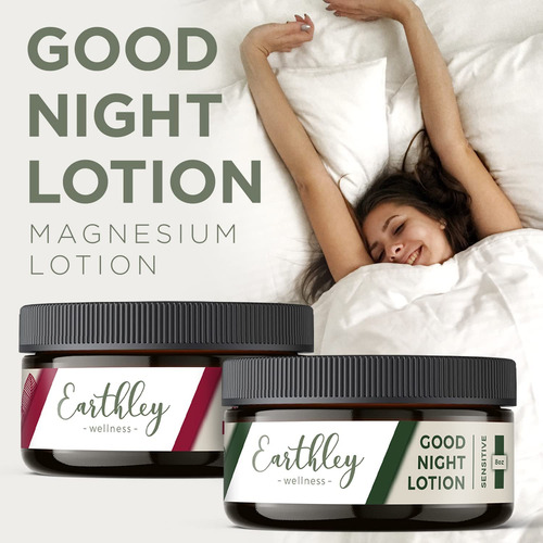 Earthley Wellness, Loção Good Night, Loção de Magnésio, Óleo de Damasco, Manteiga de Karité, Manteiga de Manga, Cera de Candelila, Óleo Essencial de Lavanda, Perfume de Lavanda — Earthley Wellness: Nossa Loção Good Night é a loção de magnésio mais limpa disponível! – Aumente o magnésio: o magnésio executa mais de 300 funções essenciais no corpo! Ao contrário dos suplementos orais, nosso creme (com aproximadamente 100 mg de magnésio por colher de chá!) tem poucas chances de diarreia ou outros efeitos colaterais. – Sono melhor: o cloreto de magnésio pode ajudá-lo a relaxar. – Multiuso: a loção Good Night, também chamada de loção corporal de magnésio, realmente não é apenas para boas noites; é essencial para seu armário de remédios naturais! – Perfume: Você pode notar um cheiro na loção, que é natural. Magnésio, lavanda e damasco têm um leve cheiro, o que não significa que o produto esteja danificado! O cheiro é forte para alguns usuários. – Instruções de uso: Aplique uma quantidade do tamanho de uma ervilha nas pernas ou na barriga 10 a 15 minutos antes de dormir. Use um pouco mais para adultos. 100 mg de magnésio por colher de chá.