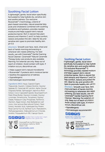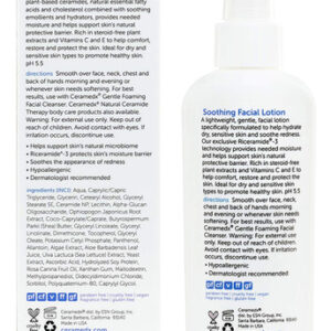 Loção facial calmante Ceramedx | Loção natural de ceramida para pele seca e sensível | Sem crueldade, vegana e sem fragrância | 4 fl oz – Tratamento leve: nossa loção facial hidratante suave é formulada especificamente para ajudar a hidratar a pele seca e sensível e acalmar a vermelhidão irritante. – Cuidados com a pele naturais à base de plantas: rica em extratos vegetais sem esteróides e ácidos graxos essenciais naturais combinados com calmantes emolientes e hidratantes fornecem a umidade necessária e ajudam a manter a barreira protetora natural da pele. – Fórmula rica em vitaminas: as vitaminas C e E ajudam conforta, restaura e protege a pele. Nosso hidratante não pesado é ideal para peles secas e sensíveis para promover uma pele saudável, jovem e radiante. – Tratamento de pele seguro para o corpo: sem parabenos, sem crueldade, sem glúten, sem fragrância, sem transgênicos e vegano! O que mais você poderia querer de uma loção? Aplique no rosto, pescoço, peito e dorso das mãos de manhã e à noite ou sempre que a pele precisar ser suavizada. – Removedor de pele seca: formulado especificamente para ajudar a curar o ressecamento, melhorar a retenção de umidade e evitar que o ressecamento se repita usando nossa tecnologia exclusiva de Riceramida-3 derivada de plantas.