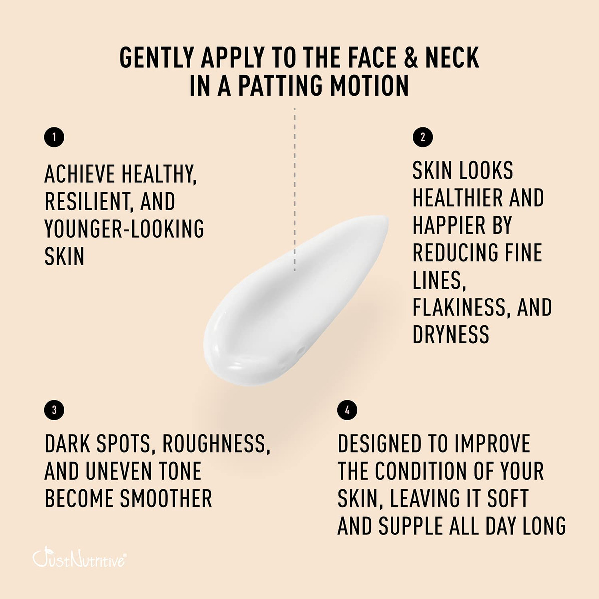 Diminua a aparência e ajude a minimizar a aparência de linhas finas e rugas com nossa loção facial antienvelhecimento. Projetado para melhorar a condição da sua pele, deixando-a macia e flexível durante todo o dia. Firma e hidrata para uma pele mais macia, pode ser usado sozinho ou sob maquiagem. Pode ser utilizado diariamente para melhores resultados aprimorados. Formulado com esqualano 100% vegetal que ajuda a melhorar a aparência da pele. Na Just Nutritive, não usamos ingredientes de origem animal nem fazemos testes em animais. Garantimos que cada frasco é feito à mão com amor nos EUA e feito com os ingredientes mais puros da Terra. – DIMINUA AS RUGAS E LINHAS FINAS | Diminua a aparência e ajude a minimizar a aparência de linhas finas e rugas com esta fórmula rica em antioxidantes que suaviza e suaviza para um brilho mais jovem. Manchas escuras, rugosidade e tom irregular tornam a pele mais lisa e radiante que você pode ver e sentir. Você obterá a aparência de uma pele suave, resistente e com aparência mais jovem. – INGREDIENTES RICOS EM NUTRIENTES | Fabricado nos EUA com os melhores ingredientes de todo o mundo. Inclui abacate, amêndoa doce, semente de framboesa vermelha, aloe vera e óleo de jojoba que melhoram a condição da pele. Os ingredientes desta loção facial antienvelhecimento para rosto e pescoço funcionam em sinergia com sua pele, pois nossa loção facial antienvelhecimento não contém parabenos. – Loção facial que desafia o envelhecimento | Projetada para melhorar a condição da pele, deixando-a macia e flexível o dia todo. Para um brilho mais radiante e saudável com um tom de pele aprimorado, adequado para todos os tipos e idades de pele. Firma e hidrata para uma pele mais macia e suave, pode ser usado sozinho ou sob maquiagem. Pode ser utilizado diariamente para obter melhores resultados. – EXPERIMENTE O QUE A NATUREZA TEM A OFERECER A VOCÊ | Formulado com esqualano 100% vegetal, que ajuda a melhorar a aparência da pele. Os benefícios antienvelhecimento potencializados pela amêndoa, framboesa vermelha e jojoba, enriquecidos com vitaminas e antioxidantes, ajudam a pele a se reparar e se renovar. Sem óleo mineral, sem silicone, sem parabenos, sem cor artificial, sem fragrância artificial. — Feito à mão com amor nos EUA | Imagine alcançar seus objetivos de pele usando um produto livre de crueldade e sem produtos químicos. Na Just Nutritive, não usamos ingredientes de origem animal nem fazemos testes em animais. Garantimos que cada garrafa é feita à mão com amor nos EUA e feita com os ingredientes mais puros da Terra. Juntos, vamos nos nutrir com a natureza.