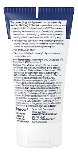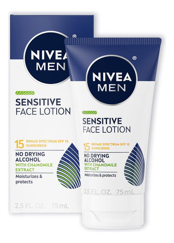 Público-alvo Palavras-chave: loção facial masculina, loção para pele sensível, protetor solar SPF 15, cuidados com a pele masculinos, loção hidratante facial, proteção UVA e UVB, loção sem álcool, loção sem corantes, vitamina E para pele, extrato de camomila, extrato de hamamélis, cuidado facial diário, loção para pele irritada, loção calmante, produtos NIVEA Men, rotina de cuidados com a pele, proteção solar para homens