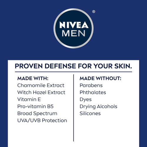 Enriquecida com vitamina E, camomila natural e hamamélica. extrato de gel, acalma e suaviza a pele irritada. Integra-se perfeitamente ao seu dia a dia masculino rotina de higiene, complementando outros produtos NIVEA para uma pele saudável e protegida.
