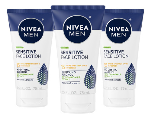 Loção facial sensível NIVEA MEN com SPF 15, protetor solar de amplo espectro, pacote de 3 tubos de 75 ml