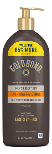 Loção masculina GOLD BOND Essentials Everyday Moisture para corpo e mãos com vitamina C, formulada para pele seca masculina, tamanho acessível, 24 onças. — Inclui um (1) frasco de 24 onças de loção hidratante masculina Gold Bond Essentials, hidratante diário para pele seca — A loção Gold Bond para homens hidrata e suaviza a pele — Esta loção hidratante é formulada com sete hidratantes e três vitaminas nutritivas — Gold Bond para homens hidrata e suaviza a pele Bond for Men é ideal para pele seca das mãos e do corpo – A loção hidratante Gold Bond Men's Essentials foi testada por dermatologistas e é hipoalergênica – O tamanho da garrafa tem 65% a mais do que 14,5 onças. – Crie uma conta TerraCycle e comece a reciclar sua embalagem vazia Gold Bond