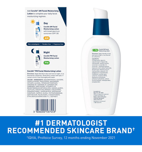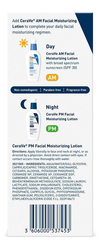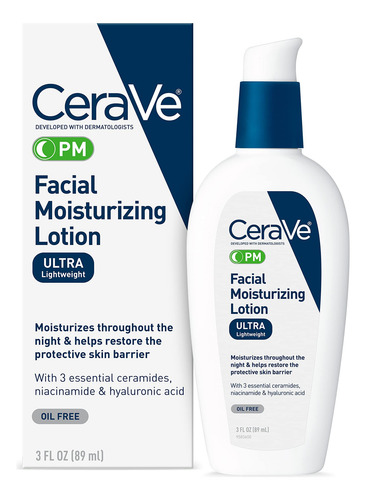 CeraVe PM Facial Moisturizing Lotion Night Cream with Hyaluronic Acid and Niacinamide Ultra-Lightweight, Oil-Free Moisturizer for Face 3 Ounce – This product is non-sealed – OIL FREE NIGHT LOTION Use Cerave PM facial lotion as the last step in an evening skincare routine. If layering with an eye cream, moisturizer or facial serum, apply the Cerave night lotion after other product applications have been fully absorbed – OVERNIGHT MOISTURIZER Ceraves PM face cream contains niacinamide to help calm the skin and uses MVE Technology to deliver hydration throughout the night. It also contains hyaluronic acid to help retain skins moisture – GENTLE ON SKIN Fragrance free, paraben-free, oil free, non-comedogenic, and allergy-tested – 3 ESSENTIAL CERAMIDES Ceramides are found naturally in the skin and make up 50% of the lipids in the skin barrier. All CeraVe products are formulated with three essential ceramides (1, 3, 6-II) to help restore and maintain the skins natural barrier – DEVELOPED WITH DERMATOLOGISTS CeraVe Skincare is developed with dermatologists and has products suitable for dry skin, sensitive skin, oily skin, acne-prone, and more.