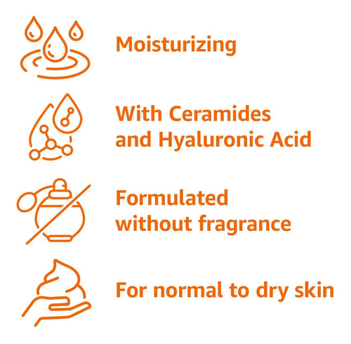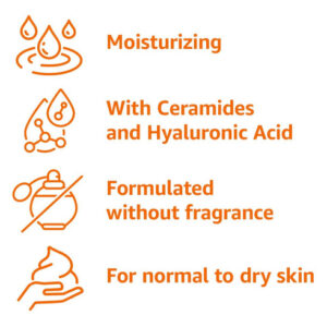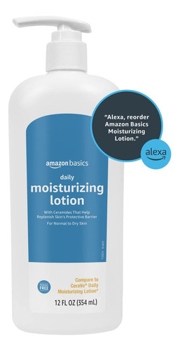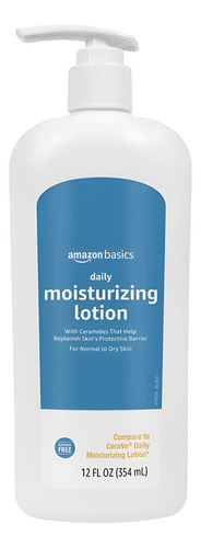 loção hidratante diária Amazon Basics, formulada sem fragrância, parabenos ou ftalatos. Enriquecido com ceramidas e ácido hialurônico, ajuda a repor e manter a umidade natural da pele. Ideal para peles normais a secas, esta loção alivia eficazmente o ressecamento com o uso diário.