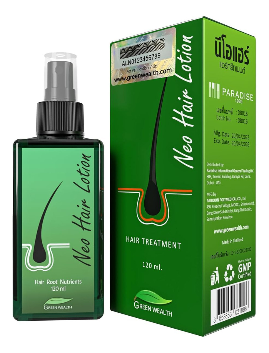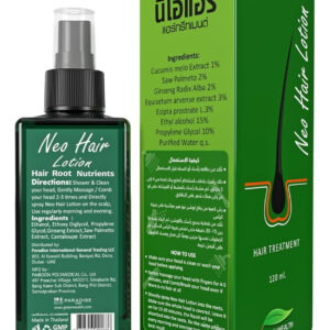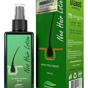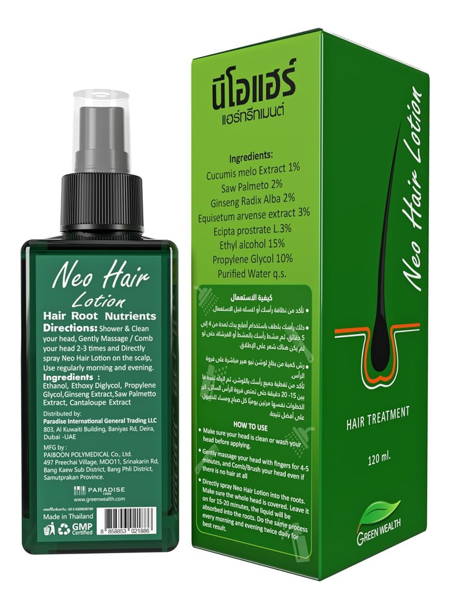 A Loção Capilar Neo é uma solução para pessoas que sofrem de queda de cabelo. A Loção Capilar Green Wealth Neo fornece cuidados capilares para queda de cabelo. Promove o crescimento do cabelo para melhorar a força do cabelo. Feito com ervas tailandesas tradicionais e medicamentos modernos, melhora a circulação sanguínea e fortalece o folículo piloso. A Loção Capilar Green Wealth Neo é uma solução para cabelos finos que impede a queda de cabelo. – A Loção Capilar Green Wealth Neo é feita de extratos de ervas para tocar no ingrediente principal. Melão, ginseng branco, folha de palmeira e lâmina de serra cuidam do cabelo para queda de cabelo. – A Loção Neo Hair usa Extrato de Cucumis Melo, que é uma forma de vitamina B necessária para prevenir a queda e promover o crescimento do cabelo. – O extrato de melão é bem usado na Loção Neo Hair, e o uso regular pode acelerar a germinação do comprimento e da força do cabelo preto para inibir a queda. O cabelo é macio e brilhante. – O extrato de ginseng estimula a circulação das células no couro cabeludo. Dê nutrientes às raízes do cabelo. O efeito da raiz do cabelo está acordado. Acelera a germinação e nutre as raízes do cabelo. – O extrato de Equisetum Arvense, também conhecido como rabo de cavalo, promove cabelos saudáveis com base em seu conteúdo de silício, impacto no colágeno e propriedades antioxidantes.