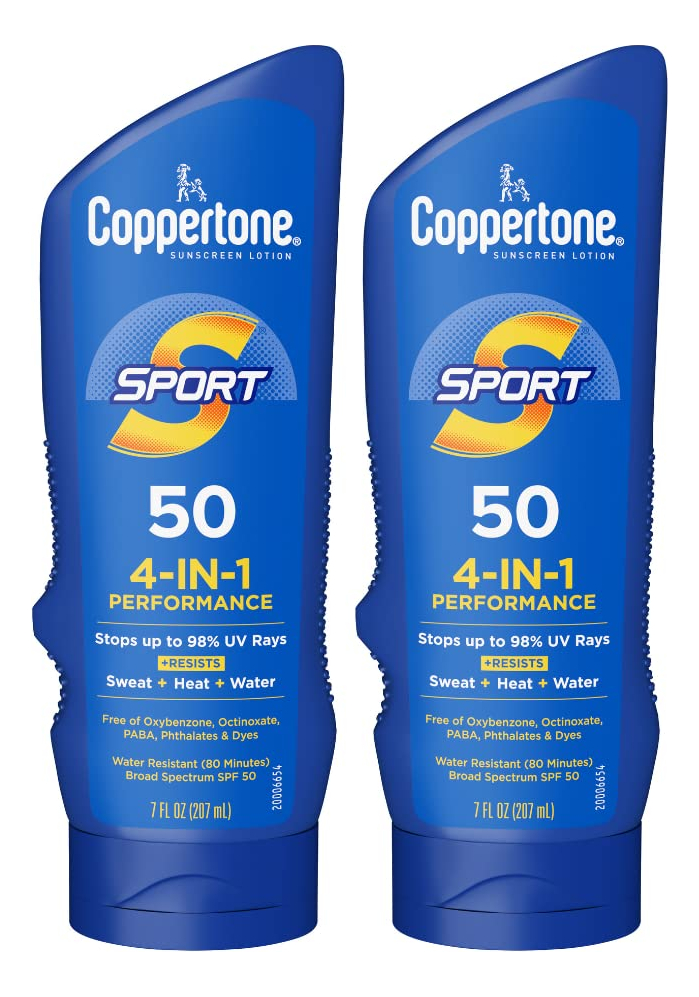 Coppertone SPORT Sunscreen SPF 50 Lotion, Water Resistant , Broad Spectrum Bulk Sunscreen Pack, 7 Fl Oz Bottle, Pack of 2 – Water Resistant: Coppertone Sport SPF 50 sunscreen lotion is water resistant (80 minutes), and stays on strong when you sweat – Free Of: This Coppertone Sport sunscreen lotion is free of oxybenzone, octinoxate, PABA, phthalates, & dyes – Bulk Sunscreen: Sunscreen bulk pack offers two lotion bottles, use and reapply as directed – Trusted Brand: Voted most trusted sunscreen brand by American shoppers based on the 2022 BrandSpark American trust study – Two (2) 7 fluid ounce bottles of Coppertone Sport Sunscreen Lotion SPF 50